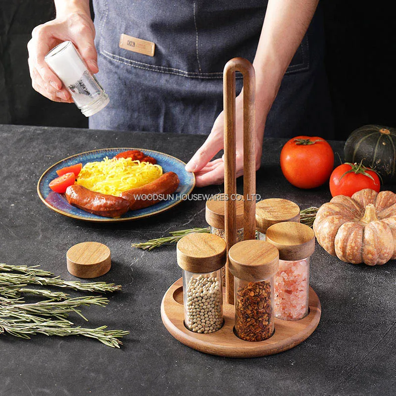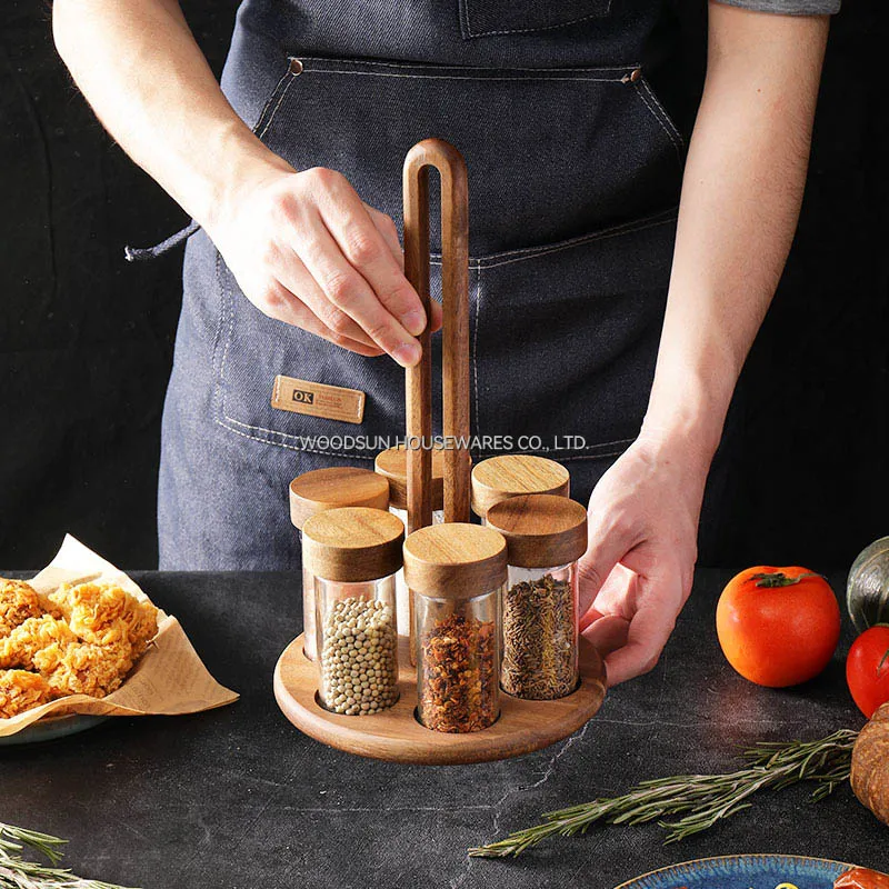 Woodsun Custom OEM Kitchenware Spice Salt Shaker Glass Rack 7pcs Spice Set Factory