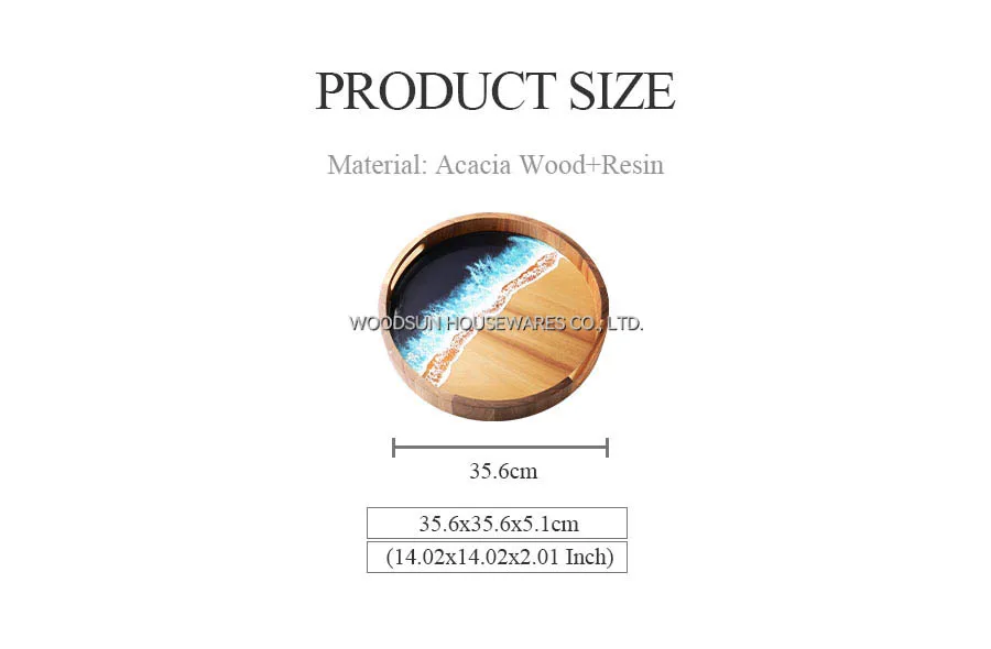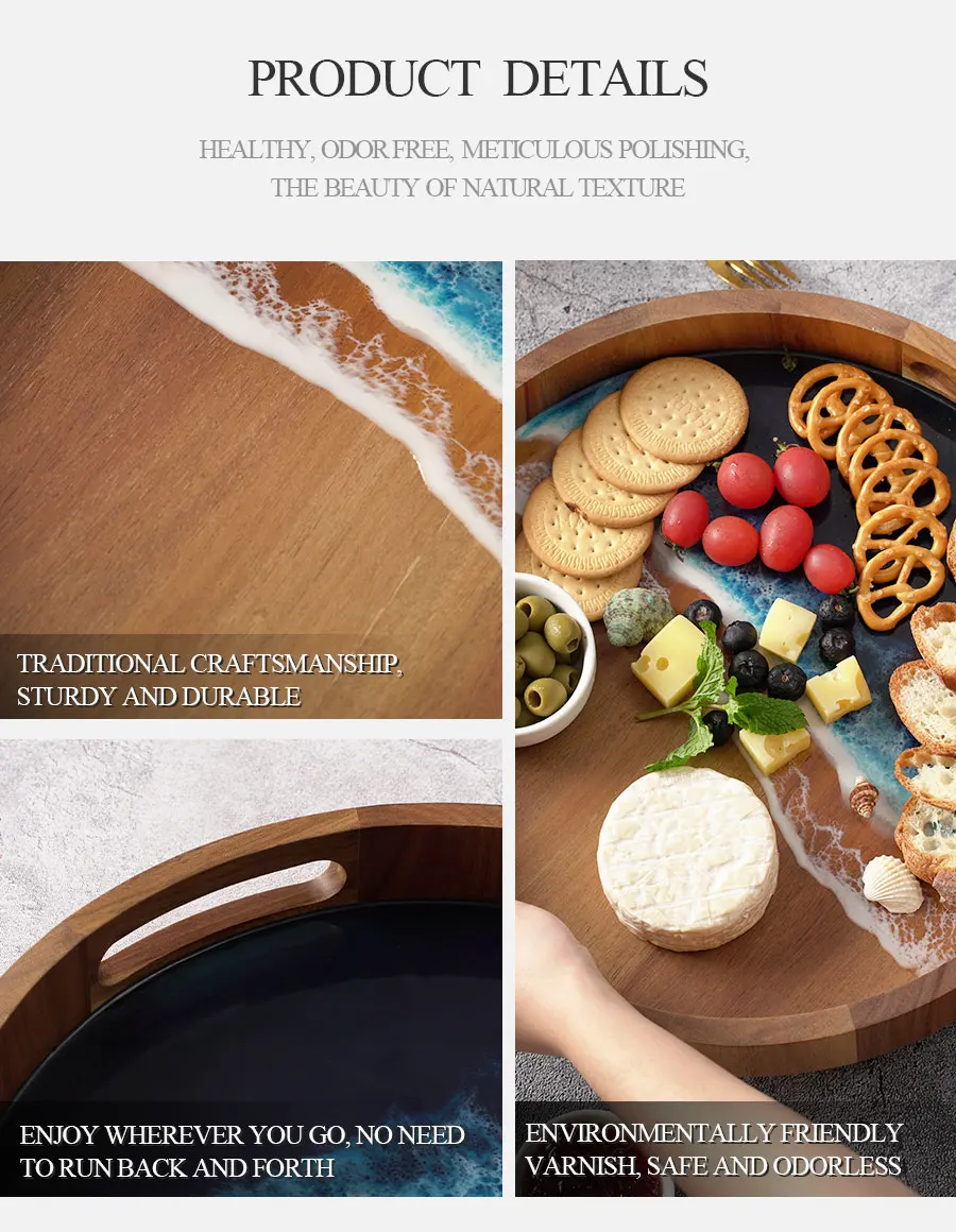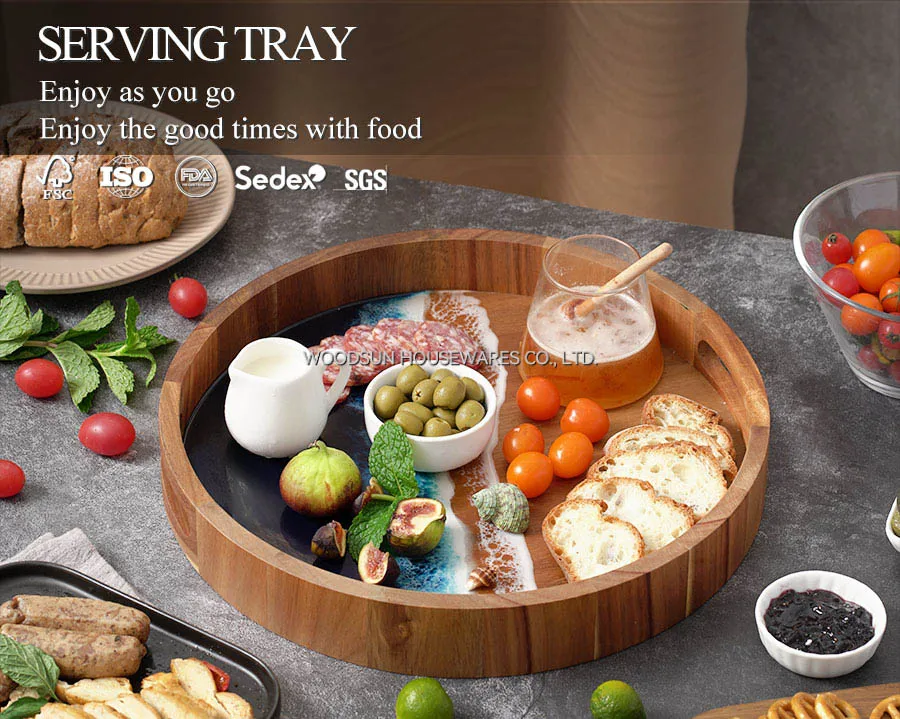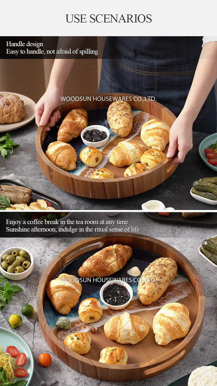 Woodsun Custom Sea Wave Resin Acacia Wood Serving Tray Storage Hotel Tray Set