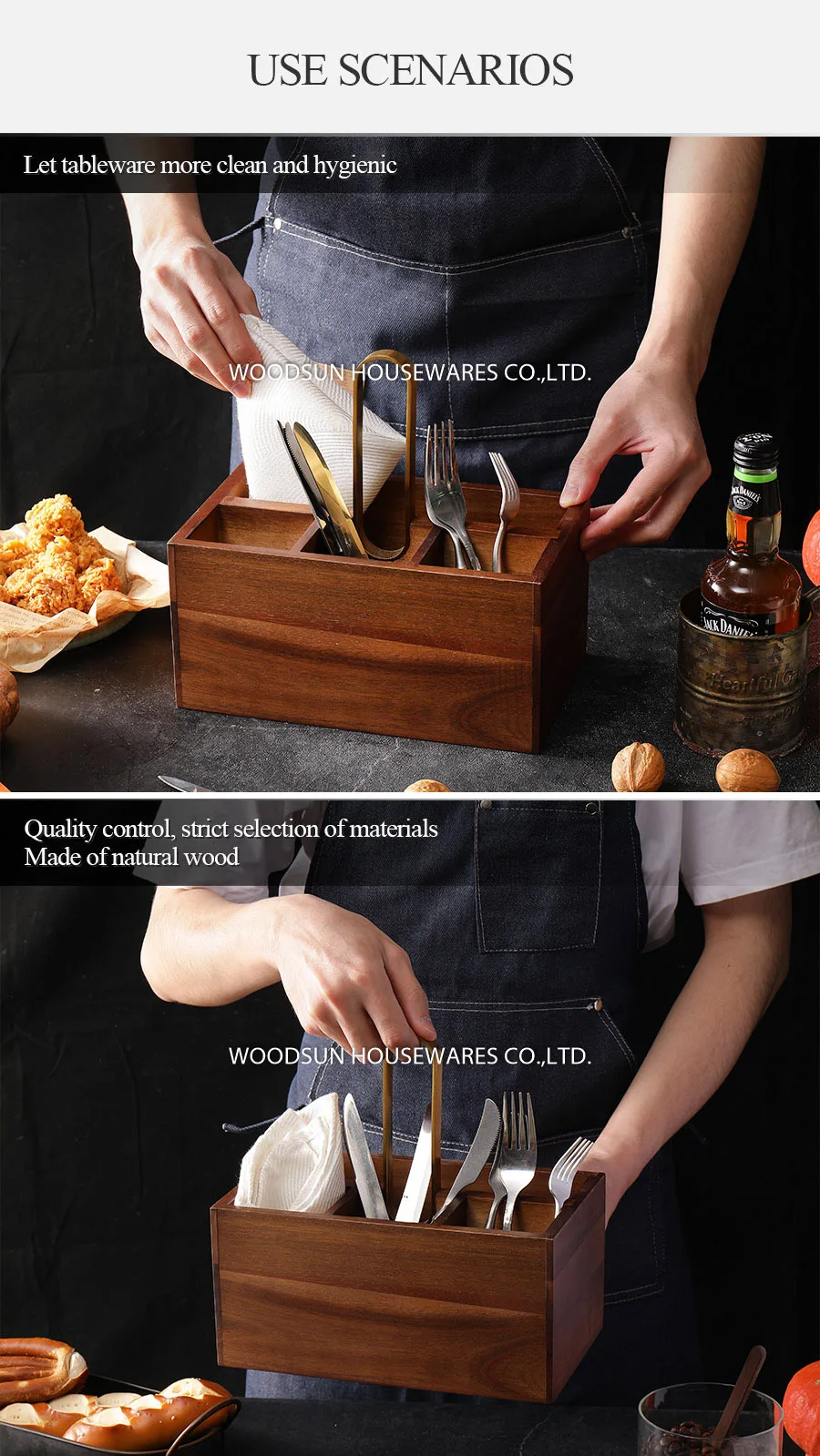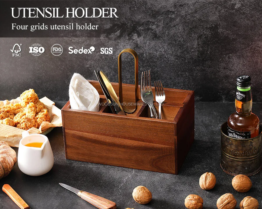 Woodsun Kitchen Table Dinnerware Basket Acacia Wood Cutlery Utensils Caddy Organizer Box Wooden Cutlery Holder for Small Utensil