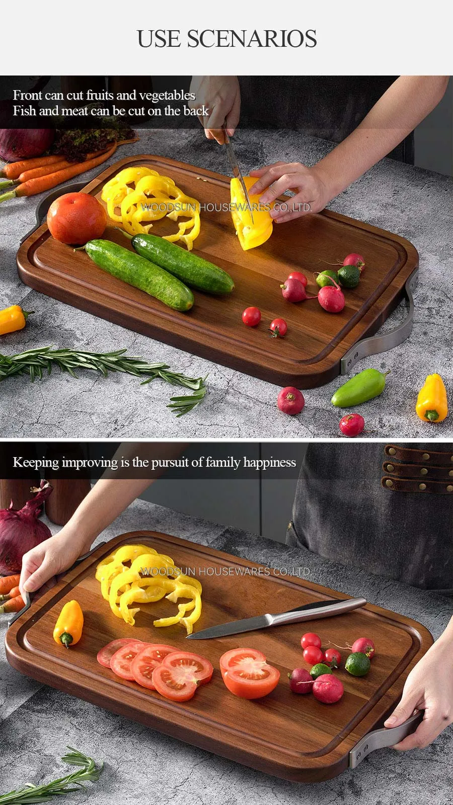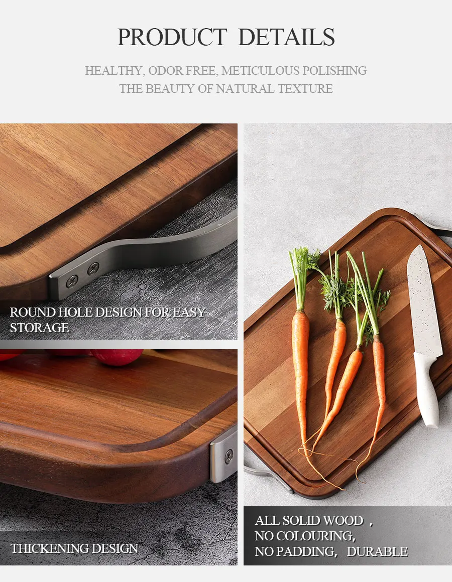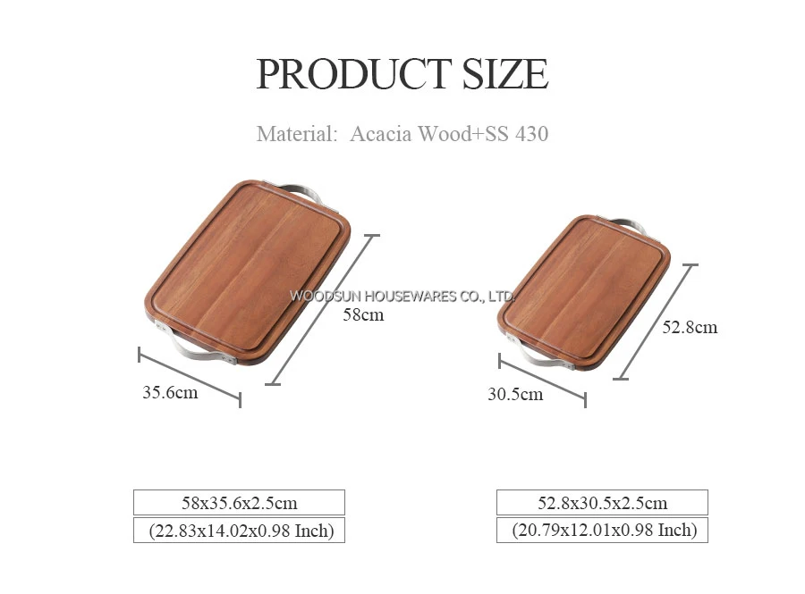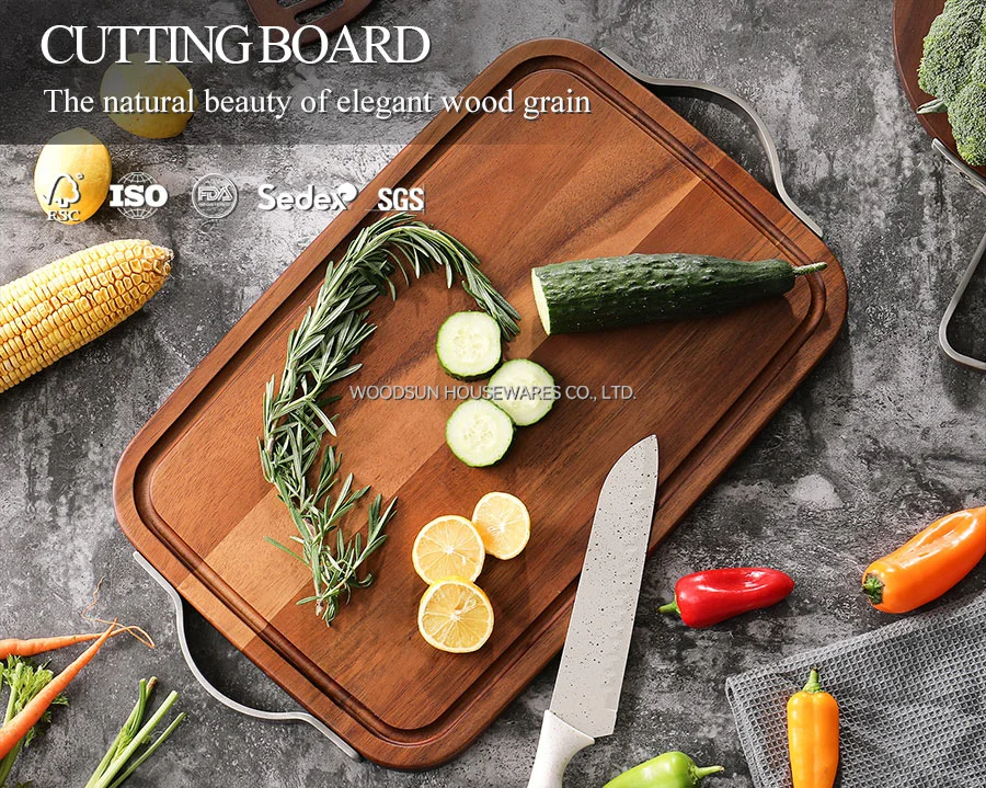 Woodsun Metal Handles Acacia Wood Butcher Block Chopping Cutting Board Wooden Cutting Board for Food Wooden Serving Tray