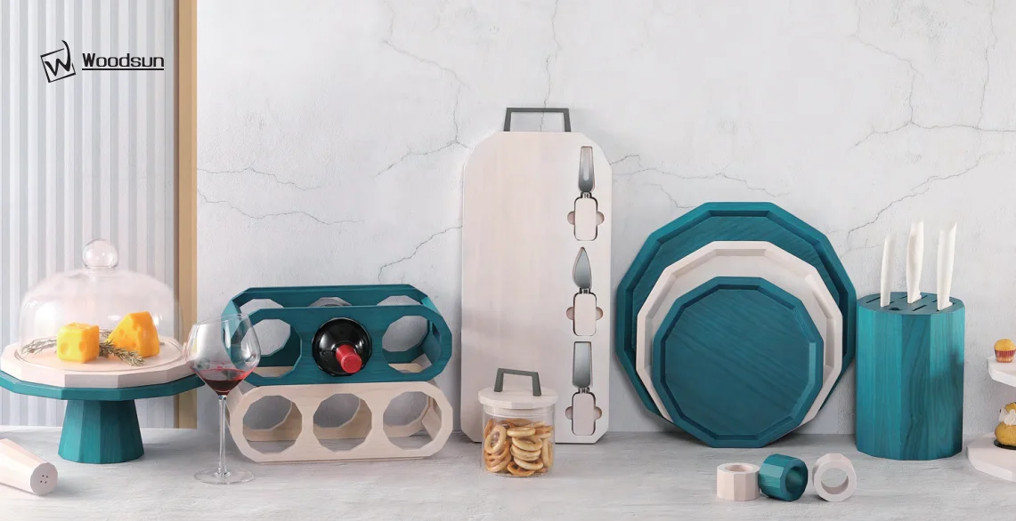 This collection features wooden products enhanced with pakka wood inlays, capturing the vividness which like a peacock's plumage. The designs emphasize geometric shape designs, showcasing the pakka wood inlays. Each piece perfectly combines the elegance ofgeometry with a riot of colors, inviting users into a fantastical world of color and form.